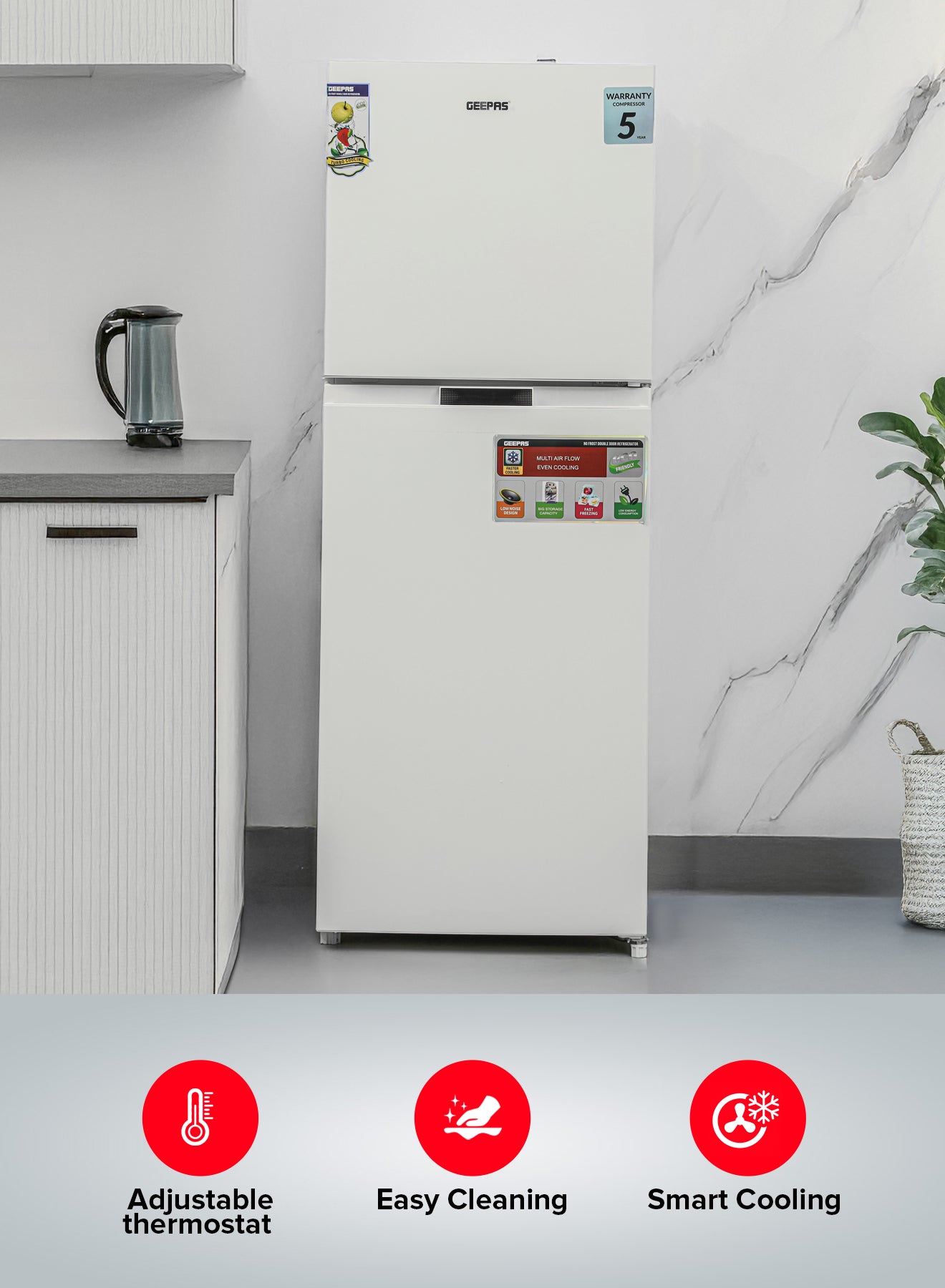 Geepas Double Door Total No-Frost Refrigerator- GRF2708WPN-U/ 270L Gross/ 200L Net Capacity, Quick Cooling, Low Noise Operation/ Equipped with Glass Shelves, Chrome Bottle Holder is backordered and will ship as soon as it is back in stock.