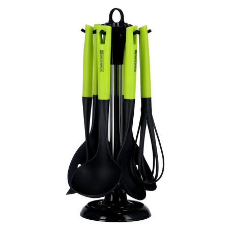 Royalford 7 Pcs Nylon Kitchen Tools Set RF9676 | Heat-Resistant Utensils up to 210°C| Non-Scratch Food-Grade Nylon Tools| Soft Grip Handles| Stainless Steel Stand