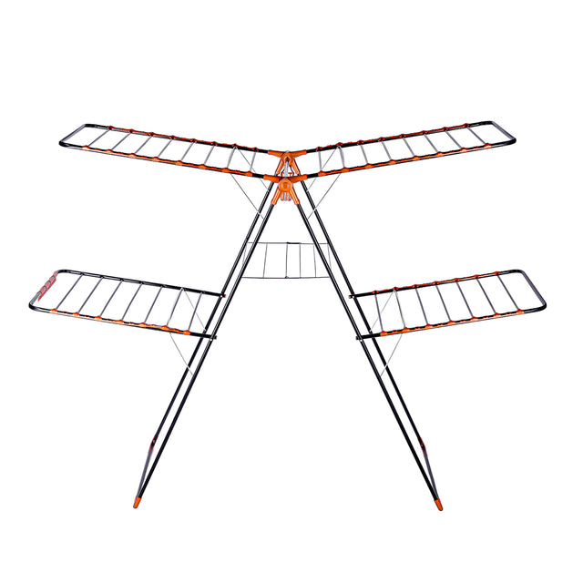 Laundry day would be easy if everything could be thrown into the dryer, but delicate fabrics just can't take the heat and the tumbling. You could put up a clothesline or drying rack outside, in the basement, or the laundry room, but both can be eyesores and take up so much space. If you're looking for a solution that makes clothes drying quick and simple, then take home our Royalford EXI 5 Layer Jumbo Cloth Dryer. This drying rack is large when fully opened. Multiple clips on one wing for hanging small pieces of garments such as socks, underwear, handkerchiefs, etc. The middle rack is ideal for placing towels or pillows. You can comfortably dry heavy materials like jeans, towels, blankets, comforters, quilts, and others. The bottom of the legs is also protected with plastic lids to avoid damage to your floor. The wings can be easily adjusted - raised or lowered to your desired height and to meet your needs; for garments that are especially long, the rack height can be adjusted to avoid contact with the ground. Your clothes can drip dry in no time. After your clothes are freshly air dried you can simply move the rack of dry clothing to your closet for storage. Or you can fold up the rack and put it away until next time. This is also convenient for people who are experiencing back pains and have difficulties bending over.