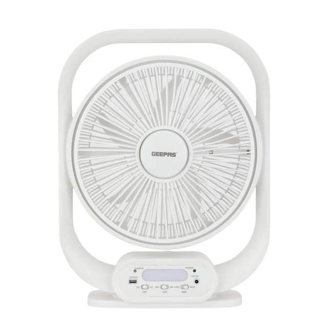 Geepas GF21189 Rechargeable 12-Inch Table Fan | Built-in LED Light | USB & Solar Charging Input| 3 Speed Settings| Long Battery Backup| Portable Design| 2 Years Warranty
