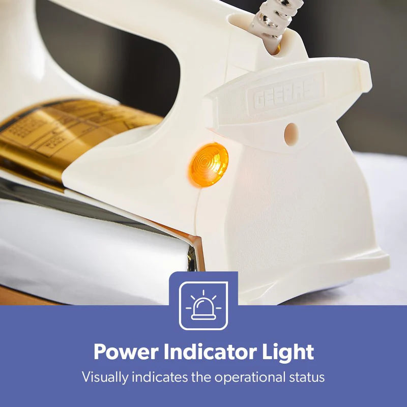Experience effortless ironing with the Geepas Automatic Dry Iron, designed for superior performance and convenience. This heavy-weight iron features a non-stick golden Teflon soleplate that glides smoothly over any fabric, ensuring wrinkle-free results every time. With its thermostatic control, automatic cut-off, and ergonomic design, it offers both safety and comfort for your daily ironing needs.