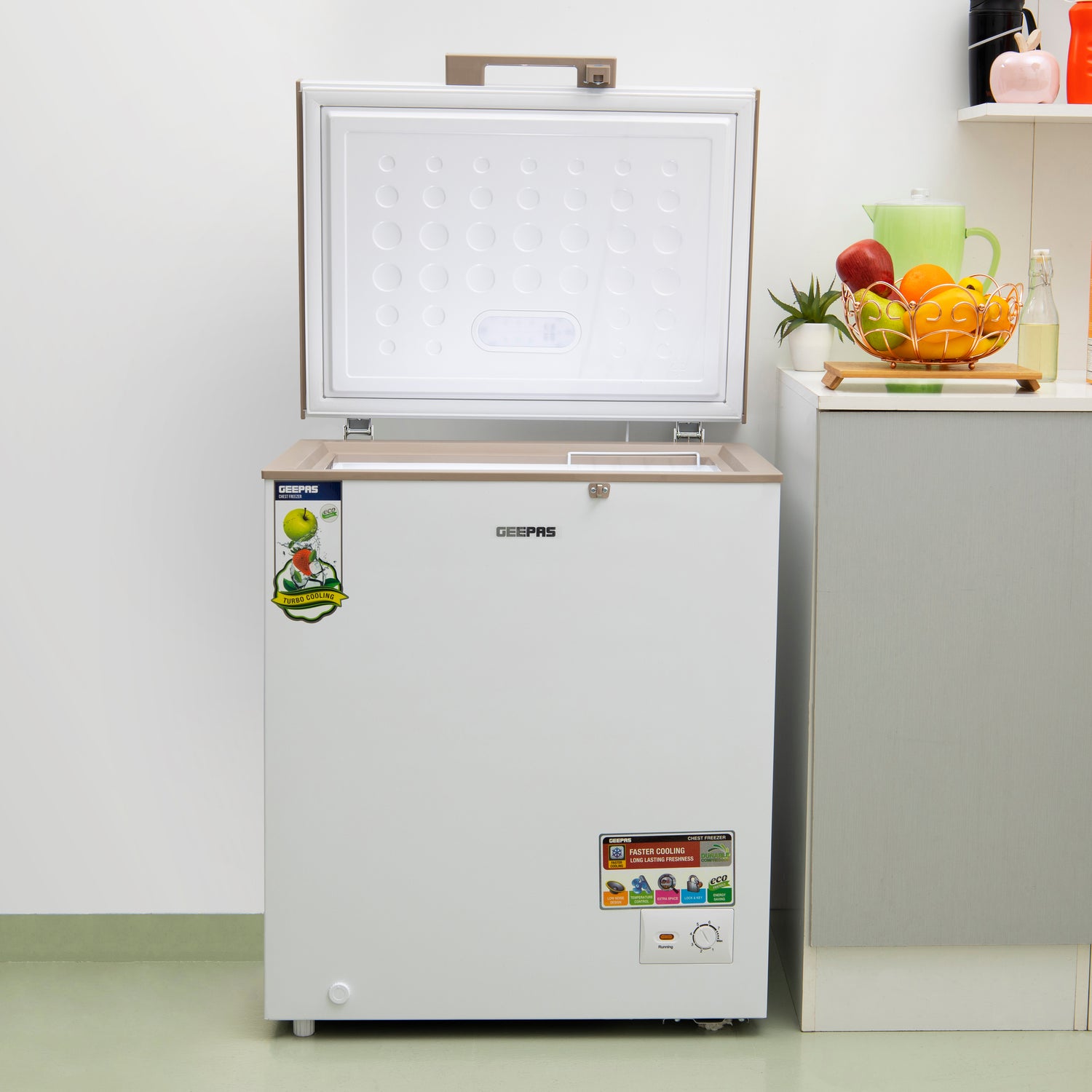 Keep your food fresh and preserved for longer with the Geepas Chest Freezer. Designed for efficiency and reliability, this freezer offers superior cooling performance with eco-friendly technology. Its compact design fits perfectly in any home or commercial setting, ensuring convenience and durability. The Geepas Chest Freezer features a frozen temperature of -18°C, a compressor switch-off function, and high-efficiency monolithic foaming for optimal energy use. The LED stylish light, lock & key mechanism, and adjustable thermostat provide added convenience and safety. Made with durable ABS, HIPS, and PP materials, it ensures long-lasting performance. Ideal for storing meat, seafood, frozen meals, and ice cream, this freezer is perfect for households, restaurants, and small businesses.