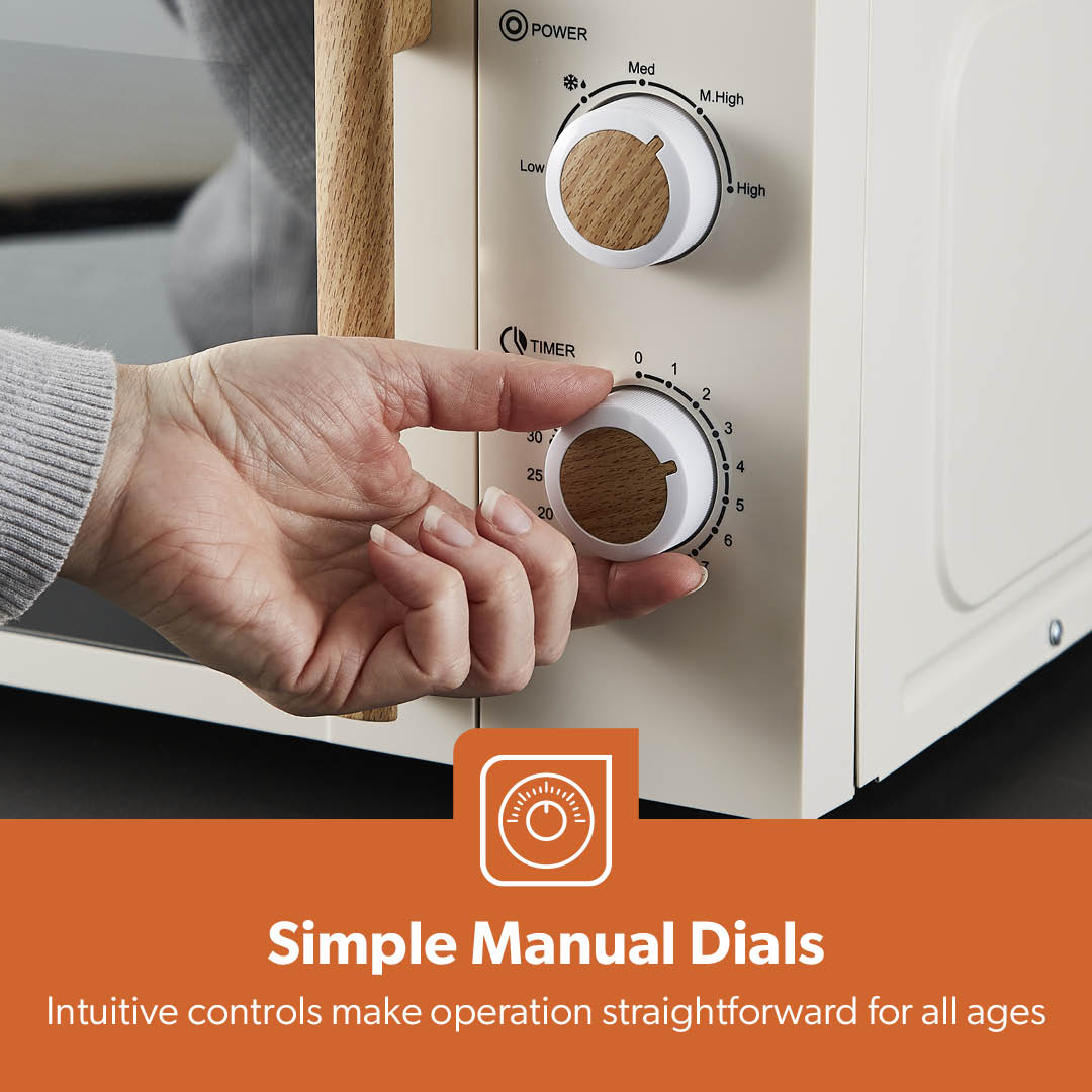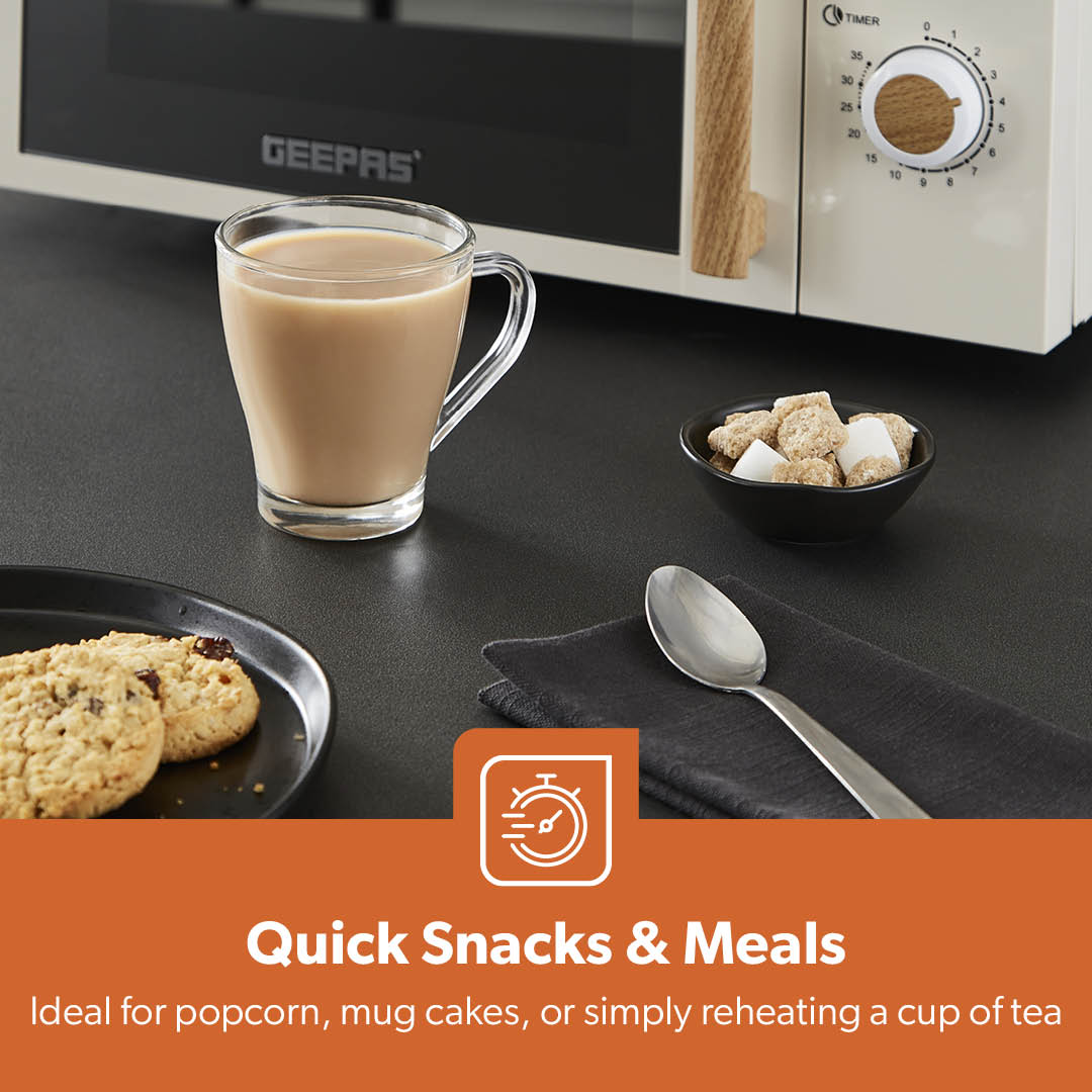 Upgrade your kitchen with the Geepas 20L Microwave Oven GMO34062UK-CR, a perfect blend of performance, style, and everyday convenience from the elegant Nordiq Collection. Designed for efficient cooking, reheating, and defrosting, this microwave features a 700W output power and 5 adjustable power levels, allowing precise control for different recipes. The 255mm glass turntable ensures even heat distribution for consistent cooking results, while the 35-minute mechanical timer lets you prepare meals effortlessly without constant monitoring. An LED interior light and cooking end signal provide better visibility and convenience during use. With its compact 20-liter capacity, this microwave is ideal for small to medium households. The stylish cream finish with wood-effect accents adds a modern Nordic touch to your kitchen décor. Durable, reliable, and easy to clean, this microwave oven is a practical and stylish addition to any modern home.