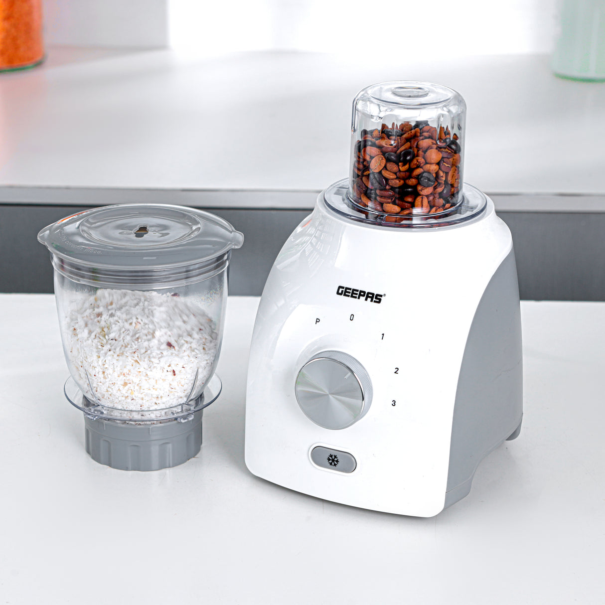 Geepas 3-in-1 Blender- GSB44034N/ 600 W, Powerful Motor with 3 Speed Setting and Pulse/ Transparent Jars with Stainless Steel Blade, Grinder, Chopper Attachment is backordered and will ship as soon as it is back in stock.