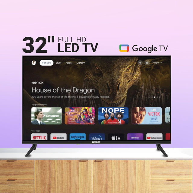 Geepas GLED3214SGXHD 32-Inch Full HD Smart LED TV brings stunning picture clarity and intelligent entertainment to your living room. Featuring Google TV, Dolby Audio, and Chromecast Built-In, this TV offers an effortless streaming experience across your favorite apps like Netflix, YouTube, and Prime Video. Enjoy vibrant colors and sharp visuals with 1920x1080 Full HD resolution and Wide Color Enhancer technology. Its slim, frameless design fits beautifully in any modern space, while multiple connectivity options including 3 HDMI ports, 2 USB ports, and RJ45 ensure seamless device integration. With powerful 2x8W speakers, 16.7 million colors, and a 178° viewing angle, you can experience lifelike visuals and immersive sound. The energy-efficient 56W power consumption and wall-mount compatibility make it a perfect choice for both performance and aesthetics.
