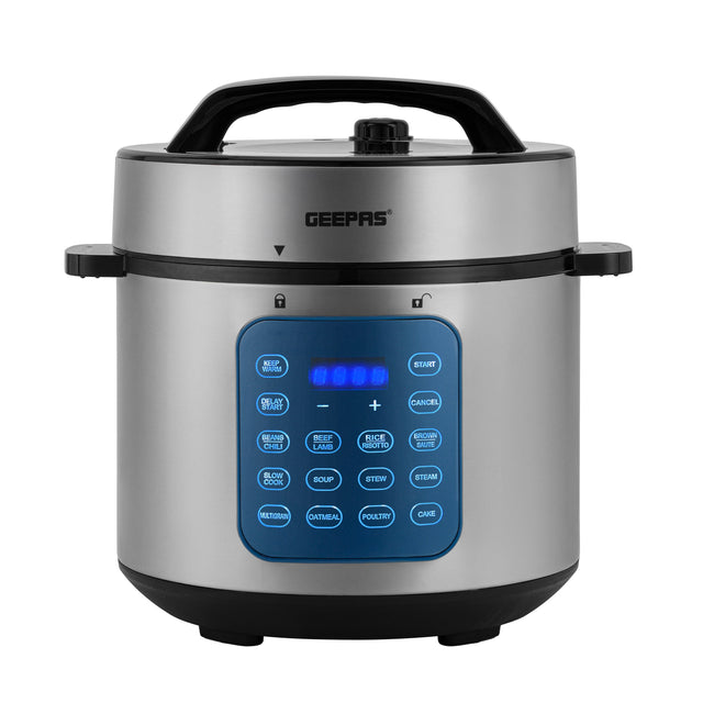 Cook smarter and faster with the Geepas GMC35053 Digital Multi Cooker, designed with a user-friendly IMD touch control panel and 12 one-touch cooking programs. Featuring 6L capacity, cook & warm modes, and a 1000W power output, this multi cooker ensures delicious meals with minimal effort. Ideal for rice, soups, stews, baking, and more – all at the press of a button. Comes with essential accessories and safety features like lid lock, overheat protection, and easy steam release.