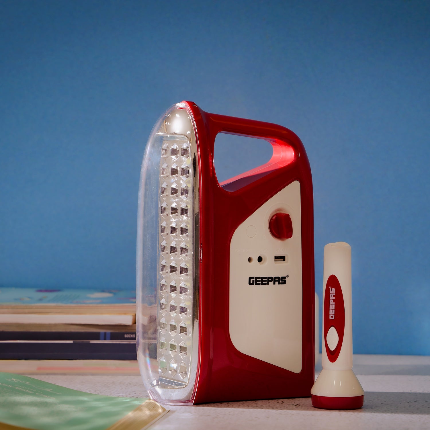 The Geepas GEFL4664 is a powerful and energy-efficient 2-in-1 rechargeable lantern and torch combo, designed to provide long-lasting illumination during power cuts, outdoor use, emergencies, and travel. With 36 high-brightness SMD LEDs, up to 200 hours of working time, and durable unbreakable PC glass, it ensures dependable lighting whenever you need it. This model includes a zoomable torch and an easy-to-carry lantern, making it perfect for home, camping, and all-purpose lighting needs. The device supports multiple charging methods including DC solar input and features mobile charging support, offering maximum convenience and safety.