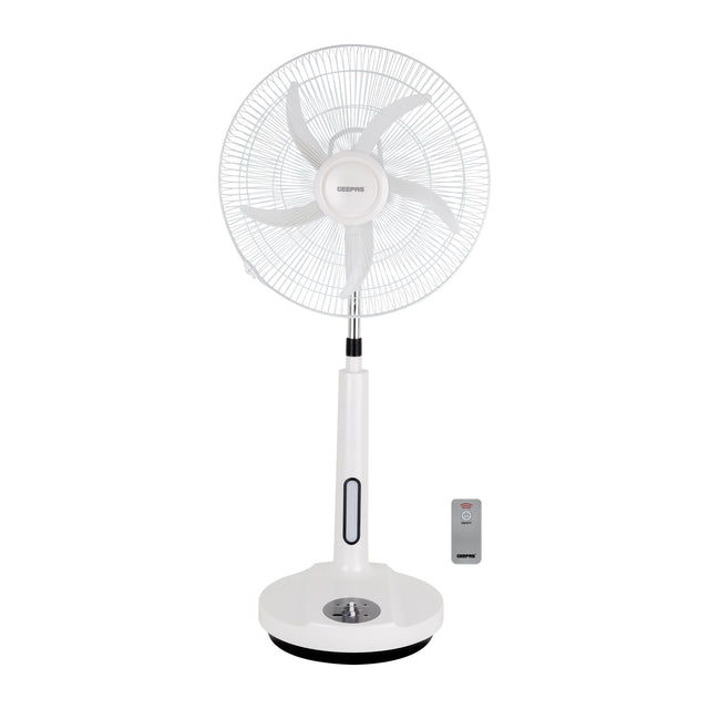 Stay cool and comfortable even during power cuts with the Geepas GF21219 18-Inch Rechargeable Stand Fan. Designed for modern homes, this versatile fan features a powerful motor, 5-leaf blade design, and 2 speed options to deliver strong and consistent airflow. Powered by a 12V 7Ah sealed lead-acid battery, the fan provides reliable backup performance and can be conveniently charged via solar input or standard power supply. The built-in LED night light adds extra convenience during nighttime use, while the remote control allows easy operation from up to 5–8 meters away. With height adjustment, smooth oscillation, and USB output for mobile charging, this rechargeable stand fan is perfect for bedrooms, living rooms, and emergency situations. Built with safety features like overcharge and over-discharge protection and backed by a 2-year warranty, the Geepas GF21219 offers dependable cooling anytime, anywhere.