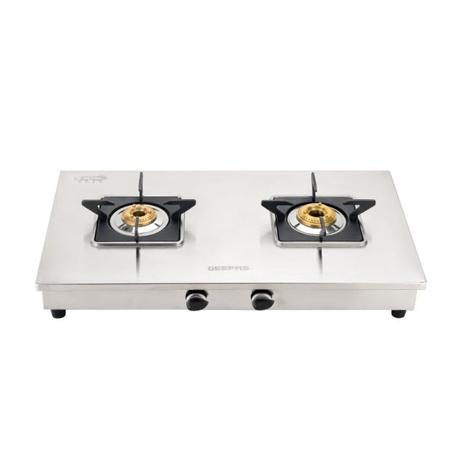 Geepas GGC31038 Stainless Steel Gas Cooker | 2 Burner LPG Stove| Auto-Ignition| Durable Brass Burners| Heavy Duty Pan Support| Safe & Efficient Cooking| 2 Years Warranty