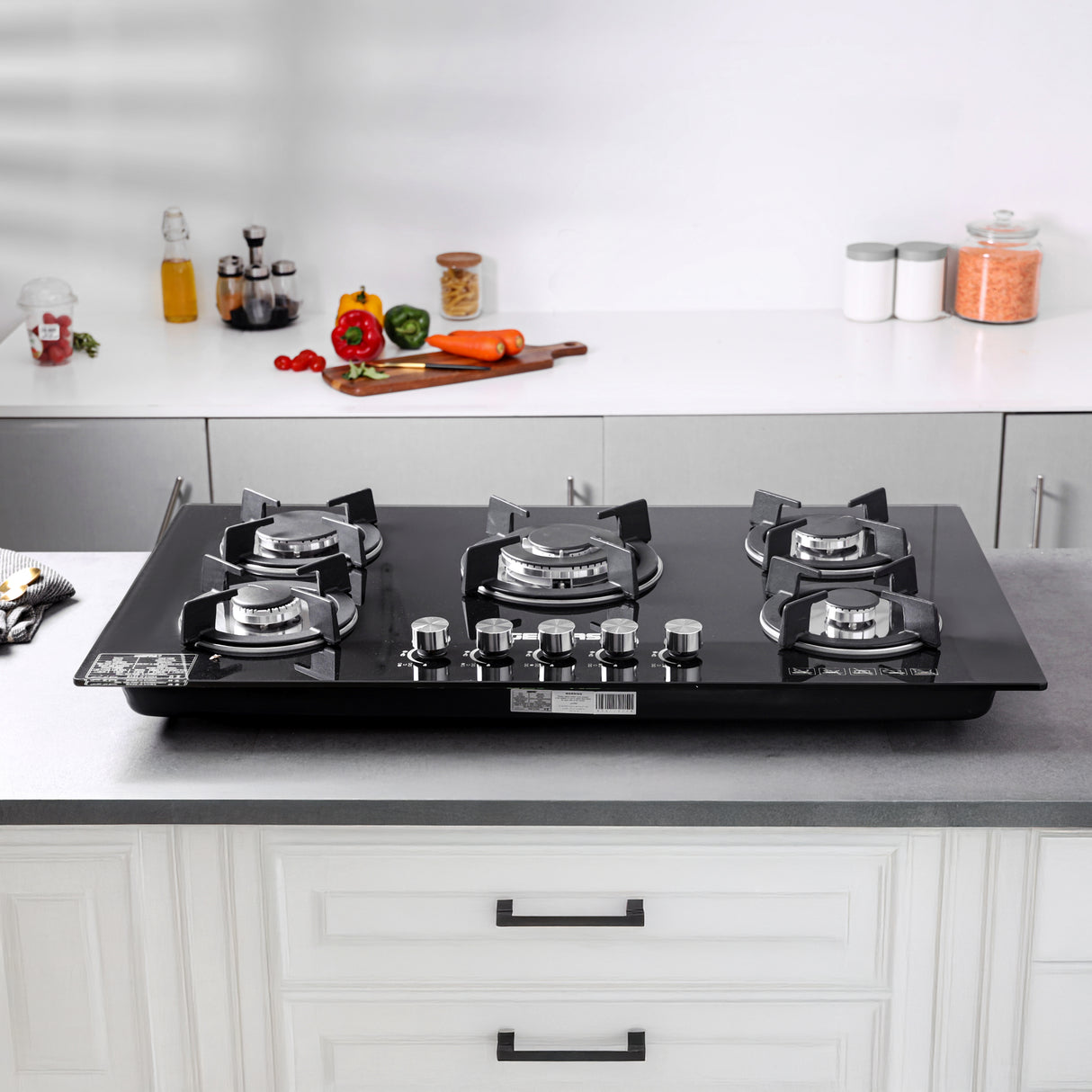 Geepas Glass Gas Hob GGC31011 | 5 Burner Gas Stove with Auto Ignition| Toughened Glass Surface| Cast Iron Pan Support & Powerful Triple Ring Wok Burner| 2 Years Warranty