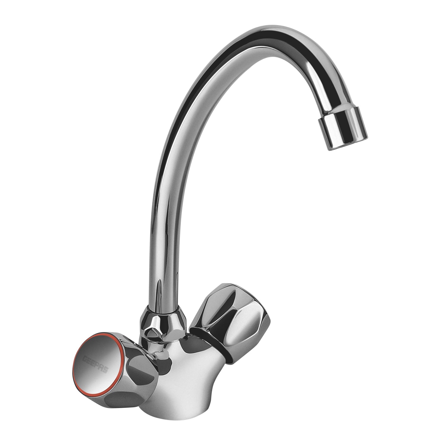 The Geepas GSW61024 Dual Handle Sink Mixer is a premium kitchen faucet designed to combine durability, efficiency, and elegant styling. Made from high-quality solid brass, this sink mixer ensures long-lasting strength and corrosion resistance, making it ideal for daily kitchen use. Featuring dual metal wheel handles, it offers precise control over hot and cold water flow, while the 1/4 turn ceramic cartridge ensures smooth operation and drip-free performance. The swiveling spout provides added flexibility for washing utensils and cleaning the sink area. Finished in a sleek chrome coating, this wall-mounted sink mixer enhances modern kitchen interiors with a clean and polished look.