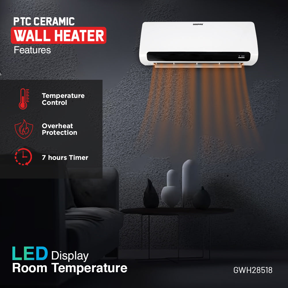 Experience fast, powerful, and efficient heating with the Geepas GWH28518 PTC Ceramic Wall Heater, designed to provide consistent warmth while saving space. Featuring advanced PTC ceramic heating technology, this wall-mounted heater delivers instant heat with enhanced safety and energy efficiency, making it ideal for bedrooms, living rooms, and offices. Equipped with two heat settings and a high-performance 2200W output, the heater allows you to adjust warmth according to your comfort needs. The LED temperature display clearly shows room temperature, while the electronic adjustable thermostat ensures precise temperature control. For added convenience, the heater includes a 7.5-hour timer, automatic oscillating louvers for even heat distribution, and a remote control for effortless operation. Built-in overheat protection and a safety thermal cut-out provide reliable protection, ensuring safe operation during extended use.