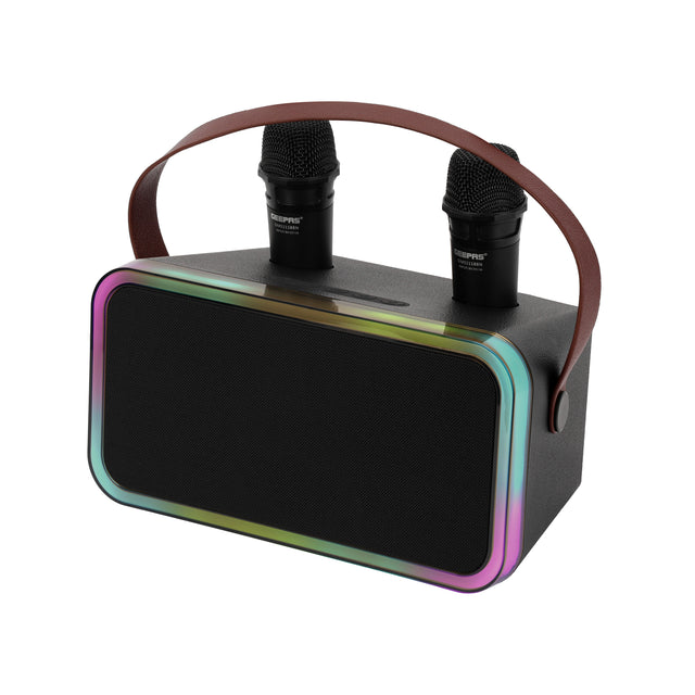 Bring music, entertainment, and fun to every gathering with the Geepas GMS11188 Karaoke Speaker. Designed for portability and performance, this speaker comes with two wireless microphones, vibrant LED lighting, and advanced Bluetooth 5.1 technology for seamless connection. Its built-in 2000mAh lithium battery provides reliable power, making it perfect for parties, picnics, indoor events, and family fun. Whether you're singing your favorite songs, hosting events, or enjoying music, this compact karaoke speaker delivers clear audio, multiple playback options, and easy controls for a complete entertainment experience.