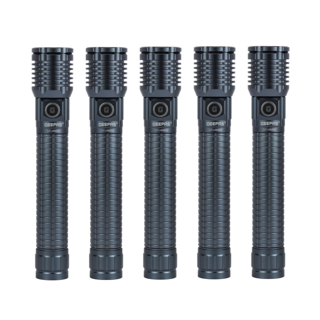 The Geepas Zoomable LED Flashlight in a convenient 5-piece combo is an essential tool for outdoor enthusiasts, emergency preparedness, and general use. Each flashlight features an advanced 25W Laser high-power LED that delivers impressive brightness, making it suitable for a variety of tasks. The durable 6063 aluminum alloy body ensures robustness, allowing it to withstand challenging environmental conditions.