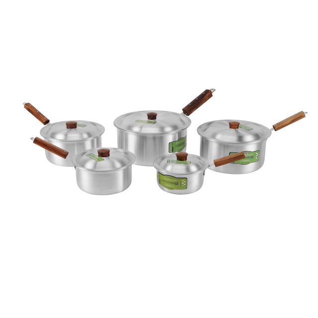 Royalford 10-Piece Aluminium Saucepan Set- RF11206| Saucepan with Lid| Premium-Quality Aluminium Saucepan with Wooden Handle| 16, 19, 21, 23, and 26 CM| Suitable for Tea, Coffee, Milk| Kitchen Use| Combo Set of 5 with Lid| Silver