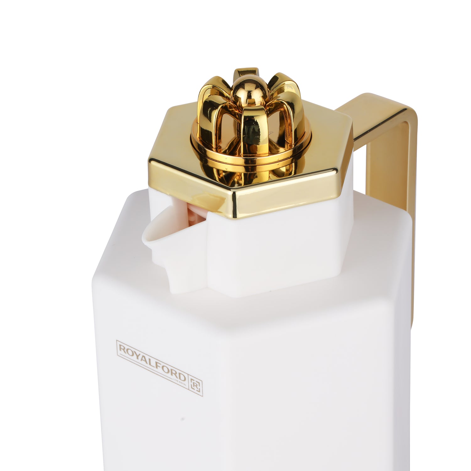 Enjoy stylish and efficient beverage storage with the Royalford RF10203 Dalia Double Wall Vacuum Flask. Designed for everyday luxury and dependable performance, this sleek 1-litre flask features a premium asbestos-free pink glass inner liner that preserves flavor while ensuring safe, long-lasting insulation. The advanced double-wall vacuum technology keeps drinks hot or cold for extended hours, making it ideal for home, office use, meetings, travel, or entertaining guests. Its leak-resistant structure and sturdy PP outer body provide durability without compromising portability. The elegant white and gold design brings a refined aesthetic to any table or serving space. With its easy-pour spout and comfortable handle, the Royalford Dalia Flask offers a smooth serving experience while maintaining optimal temperature retention for your beverages.