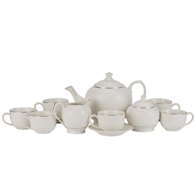Bring timeless elegance to your tea table with the Royalford RF10499 Fine Bone China Tea Set, crafted to add luxury and refinement to every serving moment. Designed with a premium textured white finish and lined with a sophisticated gold rim, this collection blends classic artistry with modern durability. The full 17-piece set includes everything you need for a beautiful tea presentation—cups, saucers, a large teapot, creamer and sugar pot with lids. Made from fine bone porcelain, it is lead & cadmium-free, safe for daily use, and offers superior resistance to chipping while maintaining a delicate, upscale appeal. Whether for family tea time, festive gatherings, or a thoughtful gift, this set is a perfect expression of taste and sophistication.