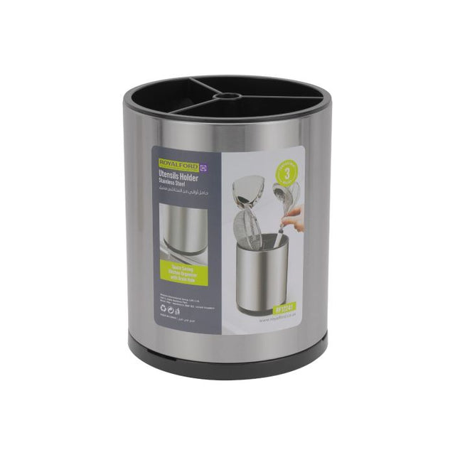 Enhance your kitchen organization with the sleek and functional Royalford RF12241 Stainless Steel Utensils Holder. Designed with a 3-compartment layout, this holder allows you to neatly separate different cooking and serving tools such as spatulas, ladles, whisks, and strainers for quick access and better hygiene. Crafted from premium stainless steel with durable ABS components, it offers excellent strength, corrosion resistance, and a modern aesthetic. The rotating base with drain hole ensures efficient water drainage, keeping your utensils dry and preventing water accumulation. Its detachable body parts make cleaning simple and hygienic. With a space-saving cylindrical design, this utensil holder fits perfectly on kitchen countertops, making it ideal for daily home use as well as professional kitchens in hotels and restaurants.