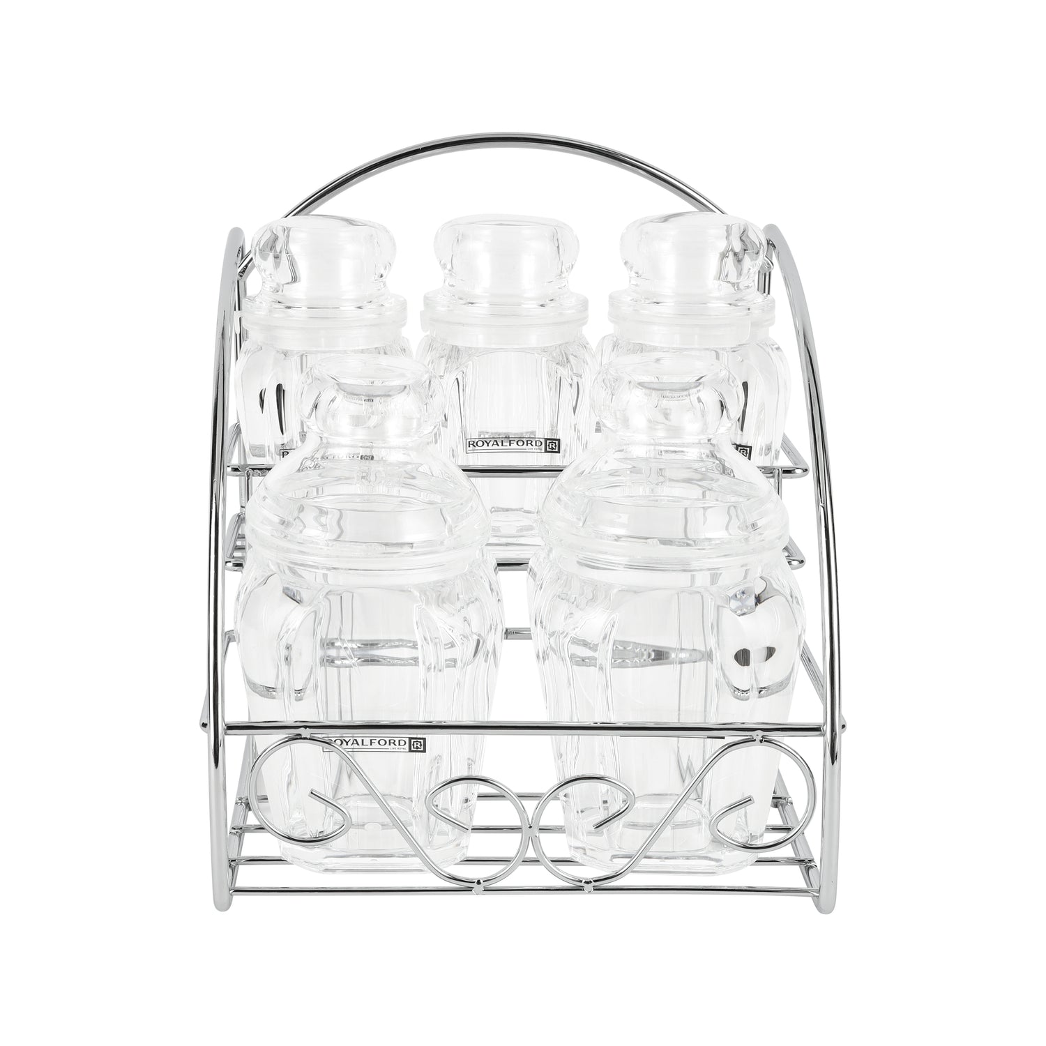 Organize your kitchen in style with the Royalford RF12768 Multipurpose Acrylic Jar Set, a practical and elegant storage solution for everyday use. This set includes 5 clear acrylic jars with a sturdy metal stand, making it ideal for storing spices, dry fruits, candies, coffee beans, sugar, and other essentials. Designed with odor-free and lead-free acrylic, the jars ensure safe and hygienic food storage while offering excellent clarity to easily identify contents. The durable construction provides long-lasting use, and the compact stand helps keep your countertop neat and organized. With mixed capacities of 120ml and 200ml, this jar set is versatile enough for multiple storage needs. It is top-rack dishwasher safe, freezer safe, and environmentally friendly, making it a smart choice for modern kitchens.