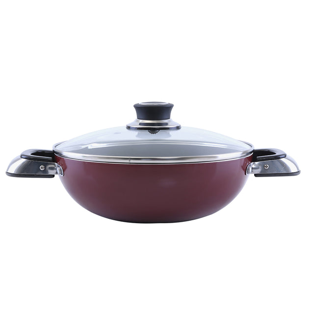 Royalford RF2947 Aluminium Wok Pan with Glass Lid, 22 CM - Induction Safe Frying Pan with Durable Non-Stick Granite Coating | Dishwasher Safe |Glass Lid & Heat-Resistant Handles - Cookware Casserole Pan