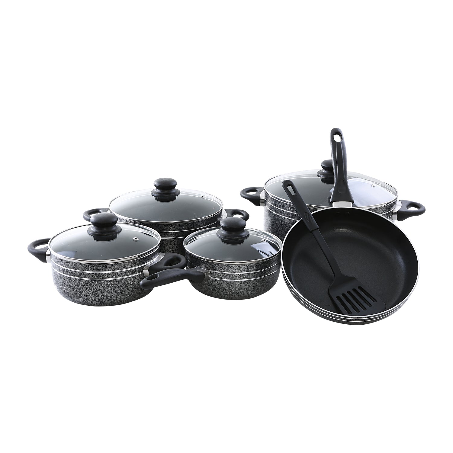 Upgrade your kitchen with the Royalford RF7065 10-Piece Non-Stick Cookware Set, designed for versatile and efficient everyday cooking. Crafted with a strong aluminium body and 3-layer non-stick coating, this set ensures uniform heat distribution, faster cooking and effortless food release. The cookware features heat-resistant bakelite handles for a safe and comfortable grip, along with tempered glass lids that allow you to monitor cooking without lifting the lid. Compatible with gas, ceramic, halogen and hot plate stoves, this set is perfect for modern kitchens. Whether you're frying, boiling, simmering or preparing daily meals, this durable and stylish cookware set ensures healthy, oil-efficient cooking with easy cleanup.