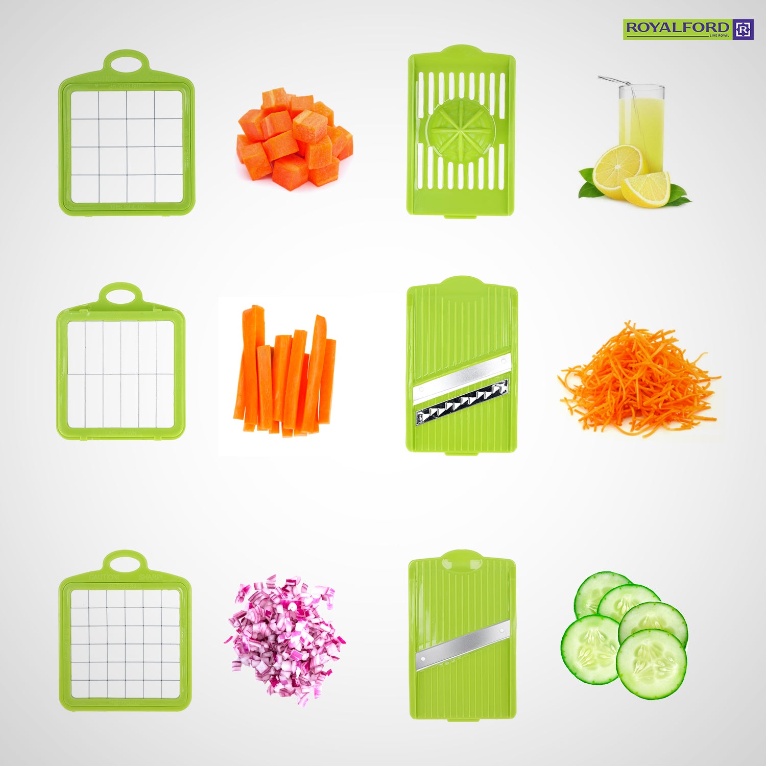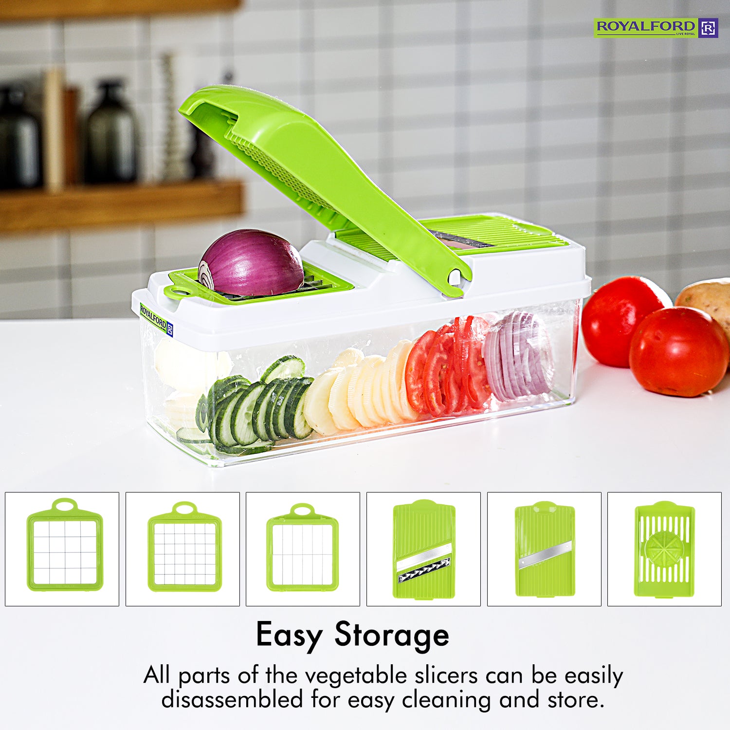 Upgrade your meal preparation with the Royalford RF7768 11-in-1 Mandolin Chopper, a versatile kitchen essential designed to slice, dice, chop and grate with absolute ease. Built with heavy-duty materials and ultra-sharp stainless-steel blades, this multifunctional chopper helps you prepare perfectly uniform vegetables and fruits in seconds—saving precious time in the kitchen. Featuring interchangeable blades, a large transparent storage container, and a safe, mess-free design, it allows you to prepare salads, meal prep ingredients, garnishes, and more with professional precision. Whether you're chopping onions, cubing potatoes, slicing cucumbers, or dicing tomatoes, this 11-in-1 system delivers consistent results every time. Easy to clean, compact to store, and engineered for smooth performance, the Royalford Mandolin Chopper is your ideal partner for daily cooking convenience.