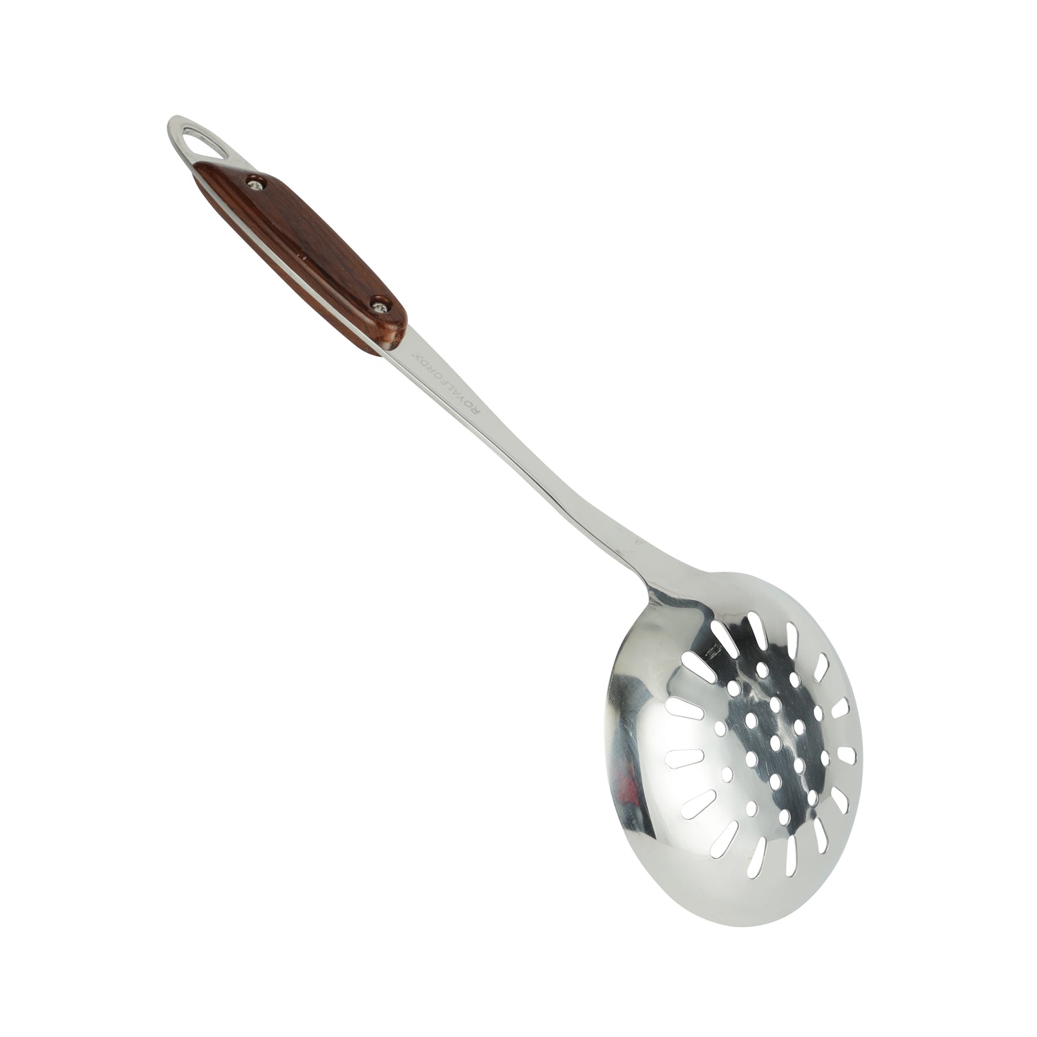 The Royalford RF9775 Stainless Steel Skimmer is an essential kitchen tool designed for safe and efficient lifting, straining, and draining of fried or boiled foods. Crafted from premium-quality stainless steel, this skimmer offers excellent durability, rust resistance, and long-lasting performance for everyday cooking needs. Its perforated bowl design allows excess oil or water to drain quickly, making it ideal for frying snacks, vegetables, pasta, dumplings, and more. The wooden-finish polymer handle provides a comfortable, ergonomic grip while adding a stylish touch to your kitchen utensils. Easy to clean and dishwasher safe, this skimmer is suitable for both home kitchens and professional cooking environments.