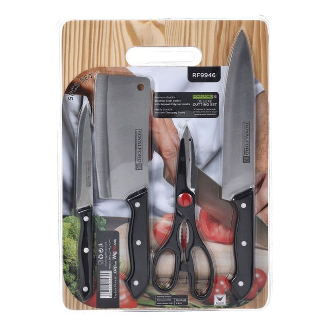 Upgrade your kitchen tools with the Royalford RF9946 Deluxe Cutting Set, a premium 5-piece collection designed for precise cutting and long-lasting performance. This versatile set includes an 8" chef knife, 6” cleaver knife, 4.5” utility knife, durable kitchen scissors, and a high-quality wooden chopping board—making food preparation easier, faster, and safer. Each piece is crafted from premium stainless steel for excellent sharpness and durability, while the ergonomic gripped polymer handles ensure comfortable and secure handling during use. Whether you're chopping vegetables, slicing meat, or performing detailed cuts, this set delivers reliability and efficiency for everyday cooking. Perfect for home kitchens, culinary beginners, and professional meal prep.
