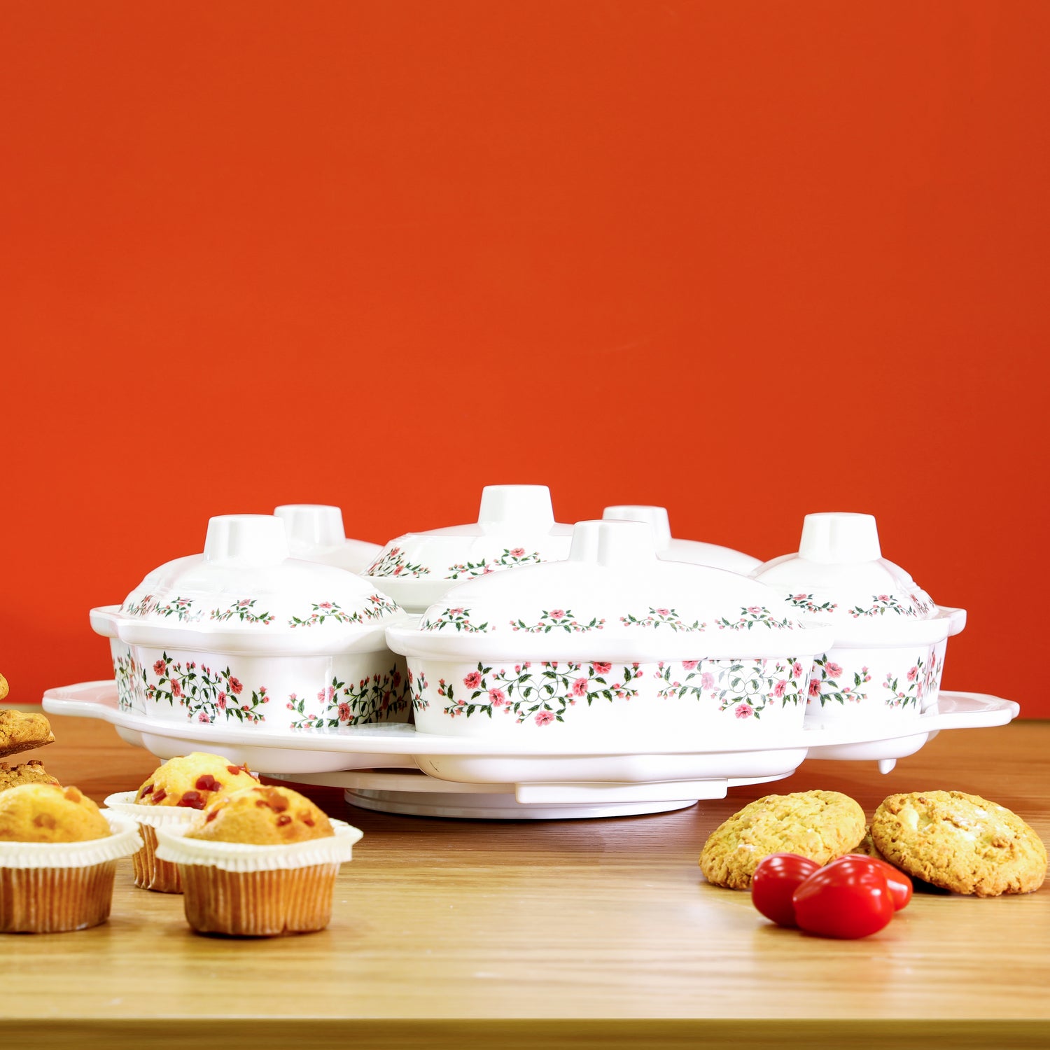 Enhance your dining experience with the Royalford RF9993 Revolving Serving Tray—an elegant floral melamine set designed for modern serving style. This 14-piece collection includes side serving bowls, centre serving bowl, fitted lids, and a 2-tier rotating tray that allows effortless access while serving guests. Crafted from premium-quality melamine, each piece is durable, lightweight, break-resistant, and beautifully designed with classic floral patterns. Ideal for snacks, dry fruits, curries, pickles, sweets, and festive serving. Perfect for family dinners, parties, functions, and gifting. A stylish and practical addition to your dining table.
